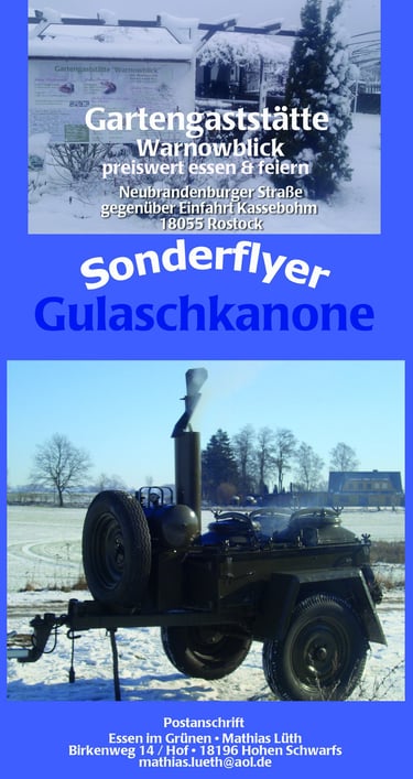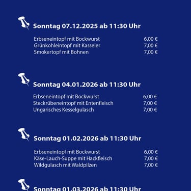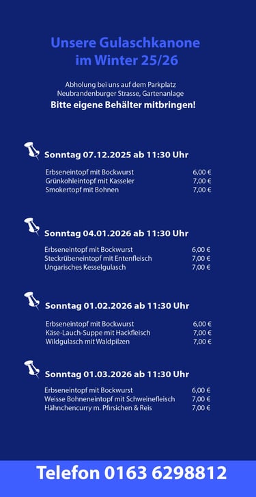 Jeden 1. Sonntag im Monat stehen wir mit unserer Gulaschkanone auf dem Parkplatz vor unserer Gaststätte und bieten jeweils 3 lecker Speisen an.